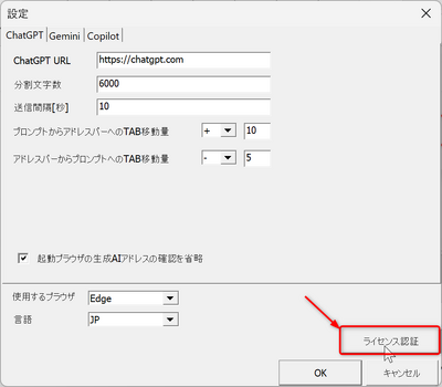 ●設定ダイアログが表示されるので、「ライセンス認証」ボタンを押します。