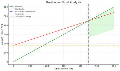 青の破線(Break-even Point)は、売上高と総費用が等しくなり、利益がゼロとなるポイントを示します。