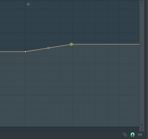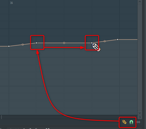 あとは、16小節目の1拍目と2拍目の間のテンポを落とす設定を追加します。まずは適当に16小節目の1拍目と2拍目の間に2つの編集点を追加するため、鉛筆マークを選択して2箇所ポチポチします。間であれば、場所は適当でいいです。あとでドラッグして位置は1拍目と同じタイミングと2拍目と同じタイミングとして設定します。