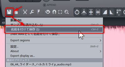 そしたら、懐かしのフロッピーマークアイコンをクリックして表示されるメニューから[名前を付けて保存]を選択して、ファイルを保存します。