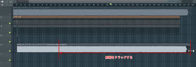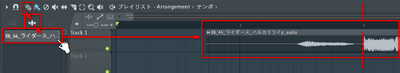 正確に配置するためには、プレイリストのスクロールバーの右端をドラッグすることで、プレイリストがズームできるので、3小節目あたりを拡大表示できるくらいに設定したり、配置したAudioClipの開始位置を調整するために、プレイリストに配置したAudioClipをドラッグして、唄いだしと3小節目がぴったり重なるように設定する必要があります。ぴったりにするためにはスナップをnoneにした状態でドラッグする必要があるかもしれません。