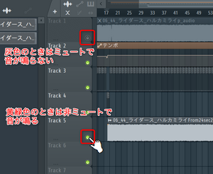 最初にプレイリストに読み込んだクリップは、最初から再生するときに音を鳴らし、途中から再生するときは、新たに追加した、途中から再生用のトラックを鳴らすように、鳴らすか鳴らさないかの制御をうまく切り替えます。切り替えるためのボタンは以下の部分です。