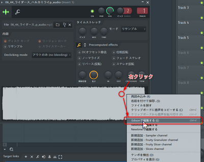 最初に作ったAudioClipのチャンネル設定を開き、波形の部分で右クリックして表示されるメニューの[Edisonで編集する]を選択します。