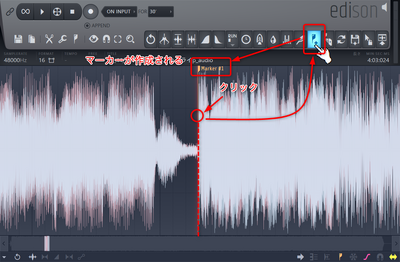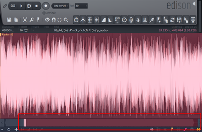 EdisonはWave編集エディタです。起動したら、再生ボタンや範囲選択を駆使して、特定の位置を探します。今回はハルカミライのライダースの16小節目の2拍目からの歌コーラスの「WowWowWowWow...Wow...Wow」の部分を探します。