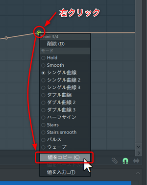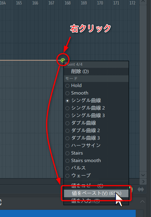 一番最後のテンポが162.619のままなので、曲の終わりまでなだらかにテンポが下がっていくようになっているので、最後も177.6になるようにします。毎回、手入力するのは疲れるので、先ほど入力したテンポをコピーしたいと思います。先ほど入力した編集点の上で右クリックして表示されるメニューから[値をコピー]を選択します。