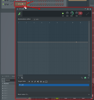 チャンネルラックにテンポという項目のオートメーションクリップチャンネルが追加されます。オートメーションは2箇所から編集できます。チャンネルラックのテンポという項目をクリックして表示されるウィンドウとプレイリストのテンポオートメーションの波形を操作する2つの方法です。プレイリストの方の編集はざっくりとした編集しかできないので、チャンネルラックのテンポという項目をクリックして表示されるウィンドウを主に使います。