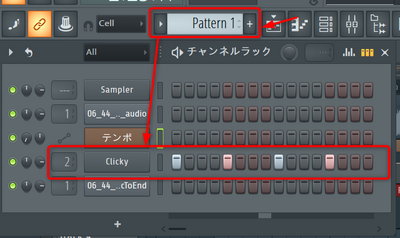 チャンネルラックのPattern1について、Beat設定で、1拍目、2拍目、3拍目、4拍目をOnにします。図ではミキサーへのトラック出力番号はトラック2としています。