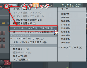 うまく配置できたら、次にテンポを制御するオートメーションを作成します。テンポ表示部の上で右クリックして表示されるメニューから[オートメーションクリップを作成]を選択します。